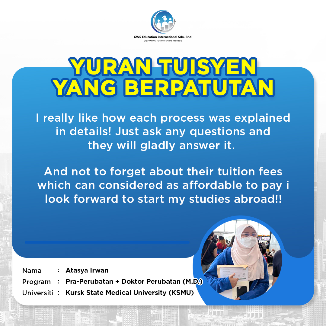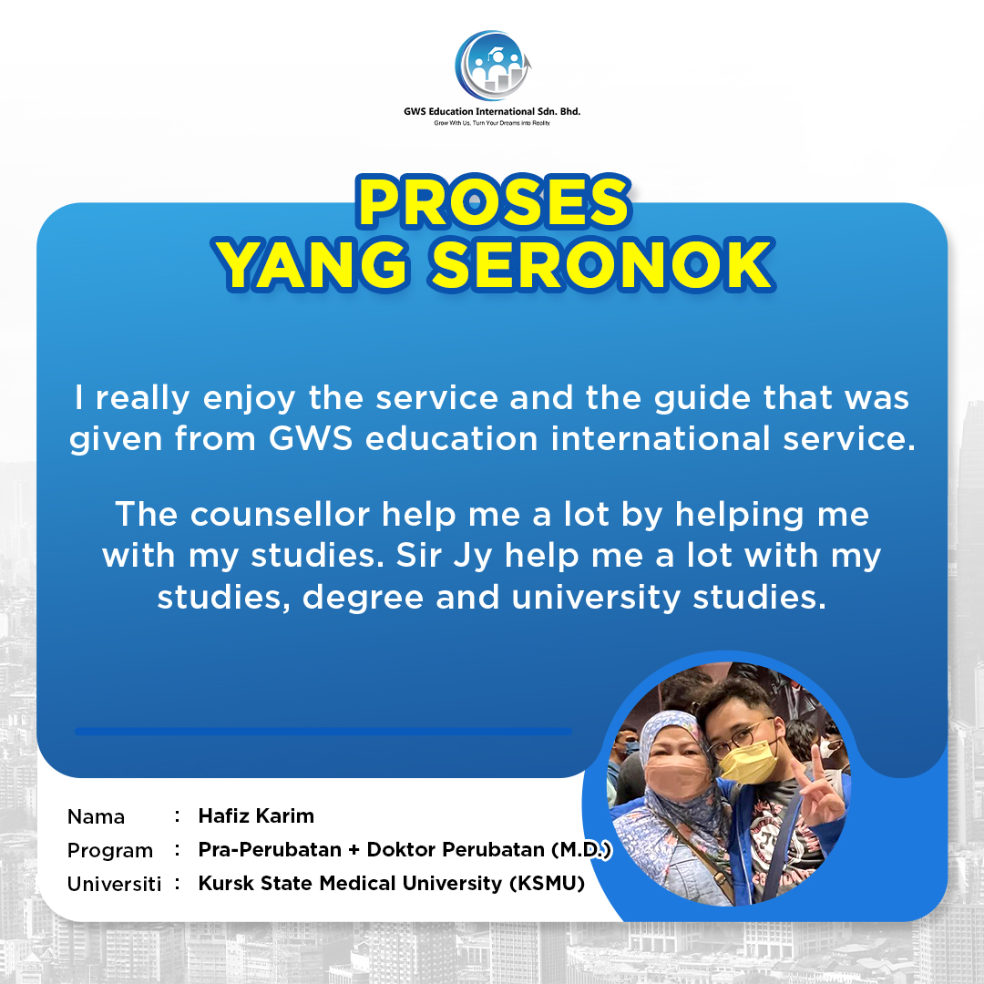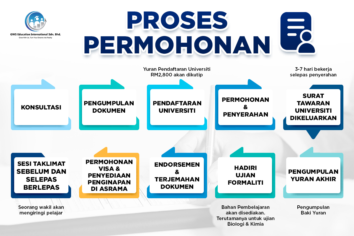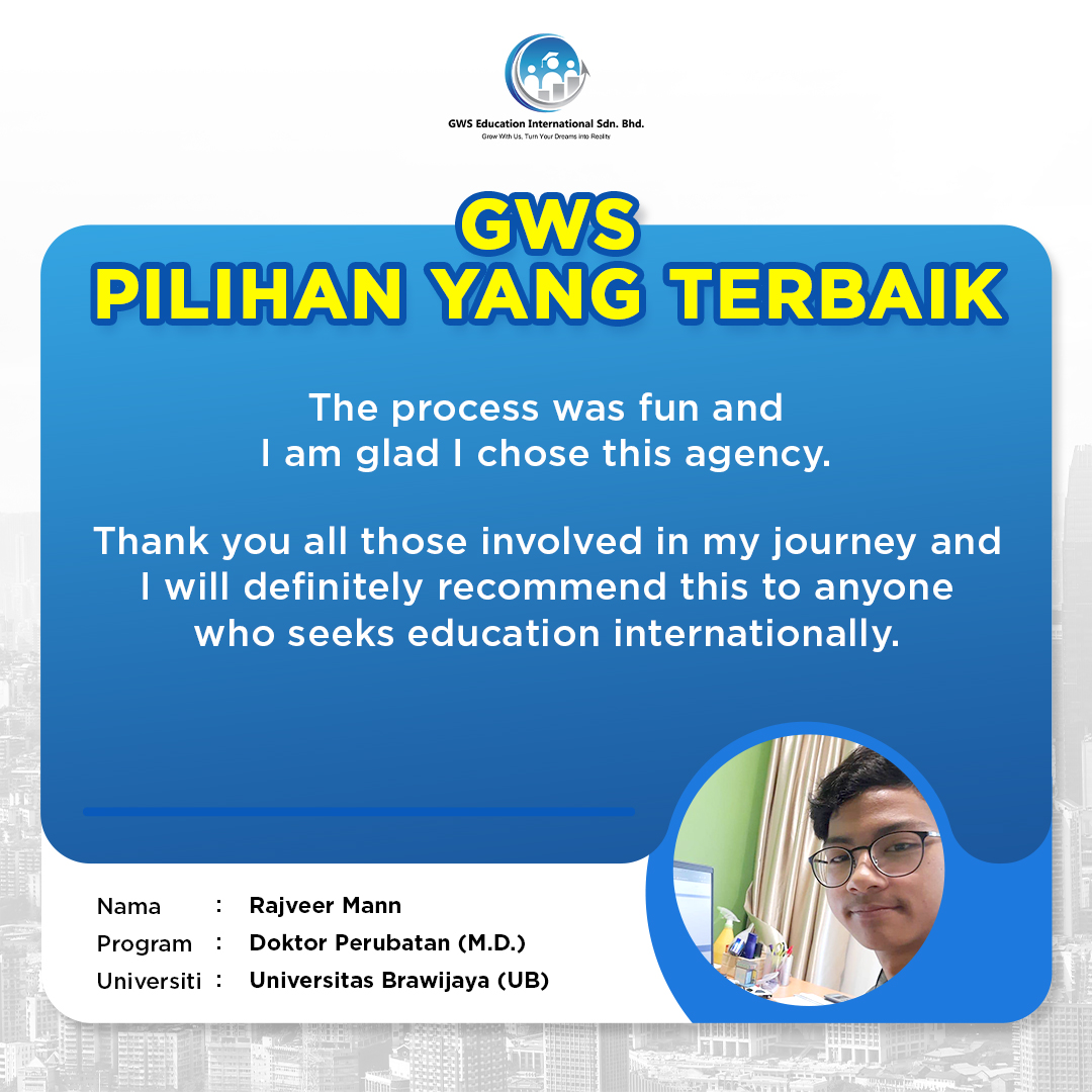GWS Education International Sdn. Bhd. merupakan pilihan terbaik untuk pengurusan pelajar-pelajar melanjutkan pengajian tinggi di luar negara. Kami menawarkan perkhidmatan profesional dalam proses pemohonan dan aplikasi university dari A – Z termasuk visa, penginapan dan lain-lain.